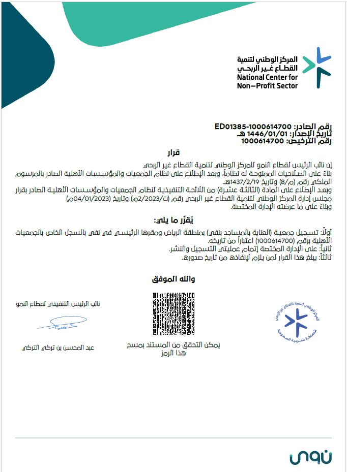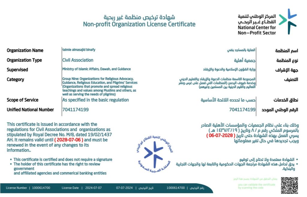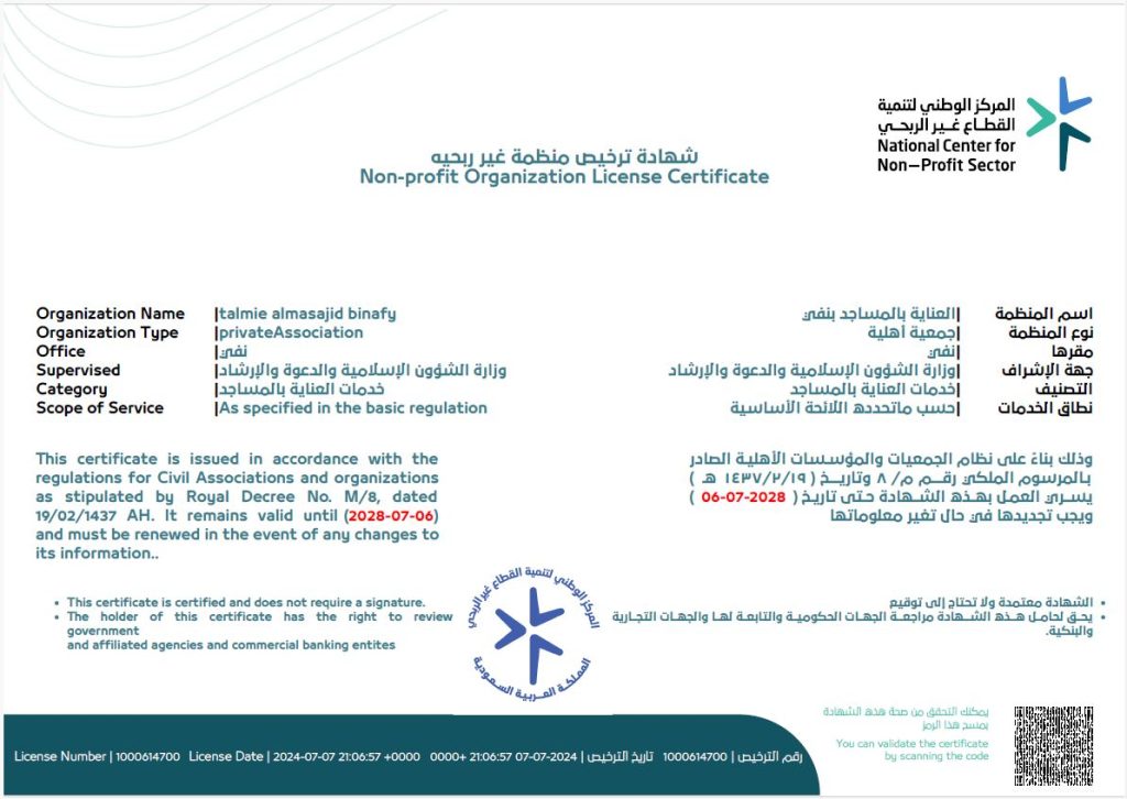 شهادة ترخيص منظمة غير ربحية (جمعية العناية بالمساجد بنفي)